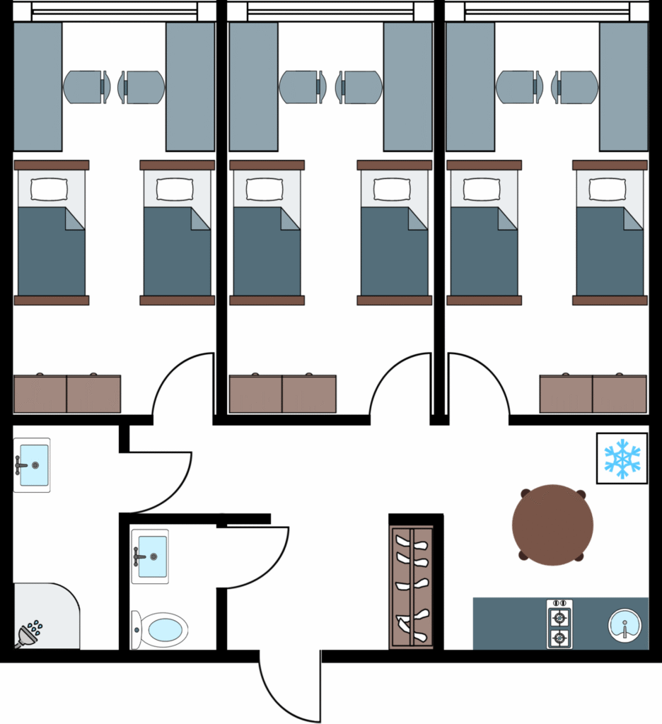 - Each apartment has 3 twin rooms (up to 6 students per apartment).