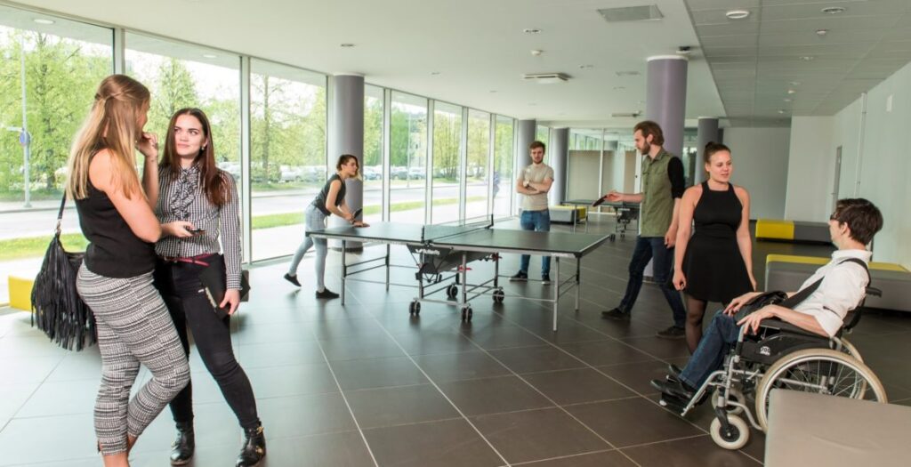 - Lobby with seating area, table tennis tables, and printer/scanner/copier for student use. A second-hand corner is also available, where residents can leave usable items they no longer need and others can take them free of charge.